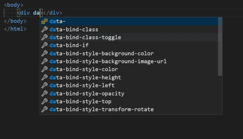 Now, if you start typing data- the data binding suggestions will appear: