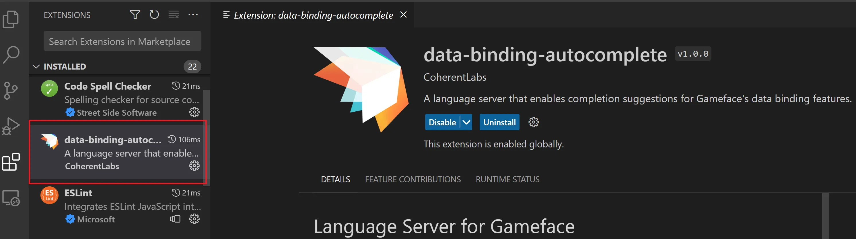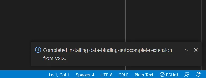 Locate the .visx file in the Gameface package and click install. You’ll get a notification saying that the extension was successfully installed: